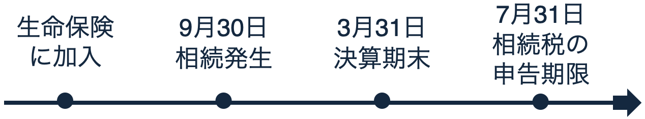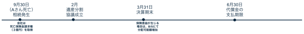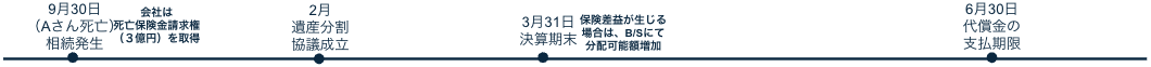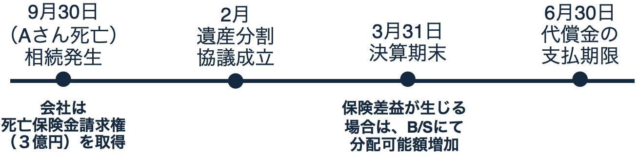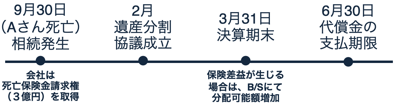 Aの死亡により、α社は9月30日に「死亡保険金請求権」を取得。その際の当該保険契約に関する資産計上累計額と、当該死亡保険金請求権の価額との差額が、保険差益(または差損)となります。保険差益が生じた場合は、3月の決算期末を経て、分配可能額が増加することとなり、それにより自社株買取できる額が増えることになります。