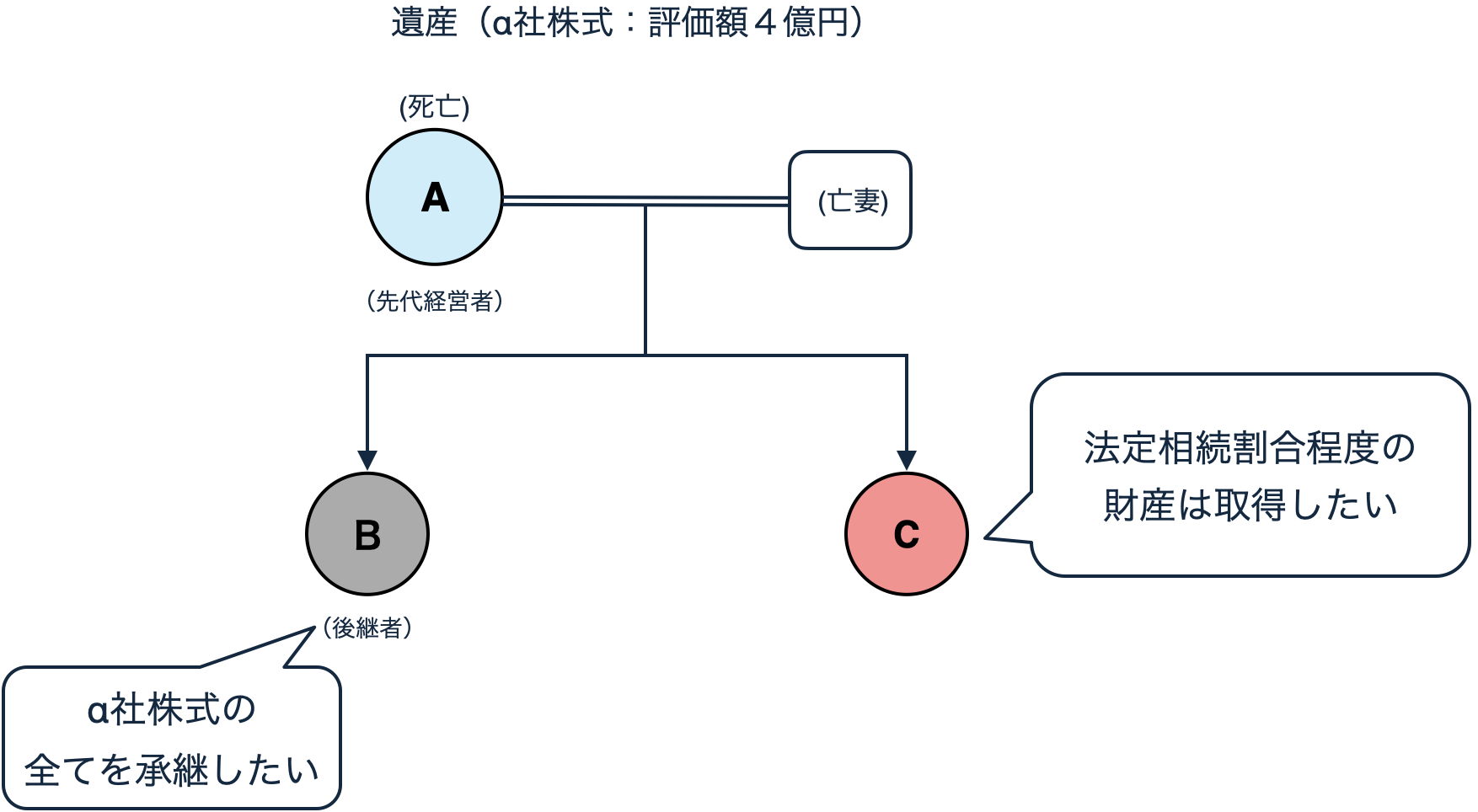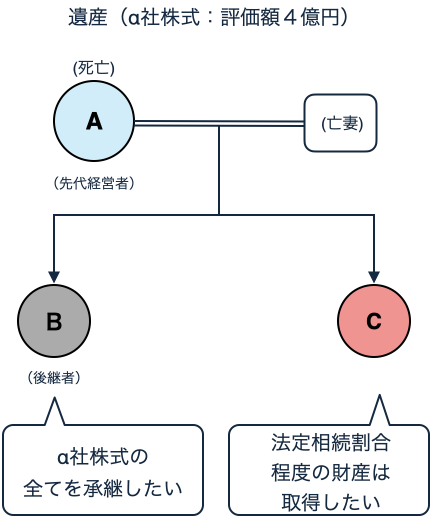・Bはα社株式のすべてを承継したいが、Cは法定相続割合程度は取得したいと主張。